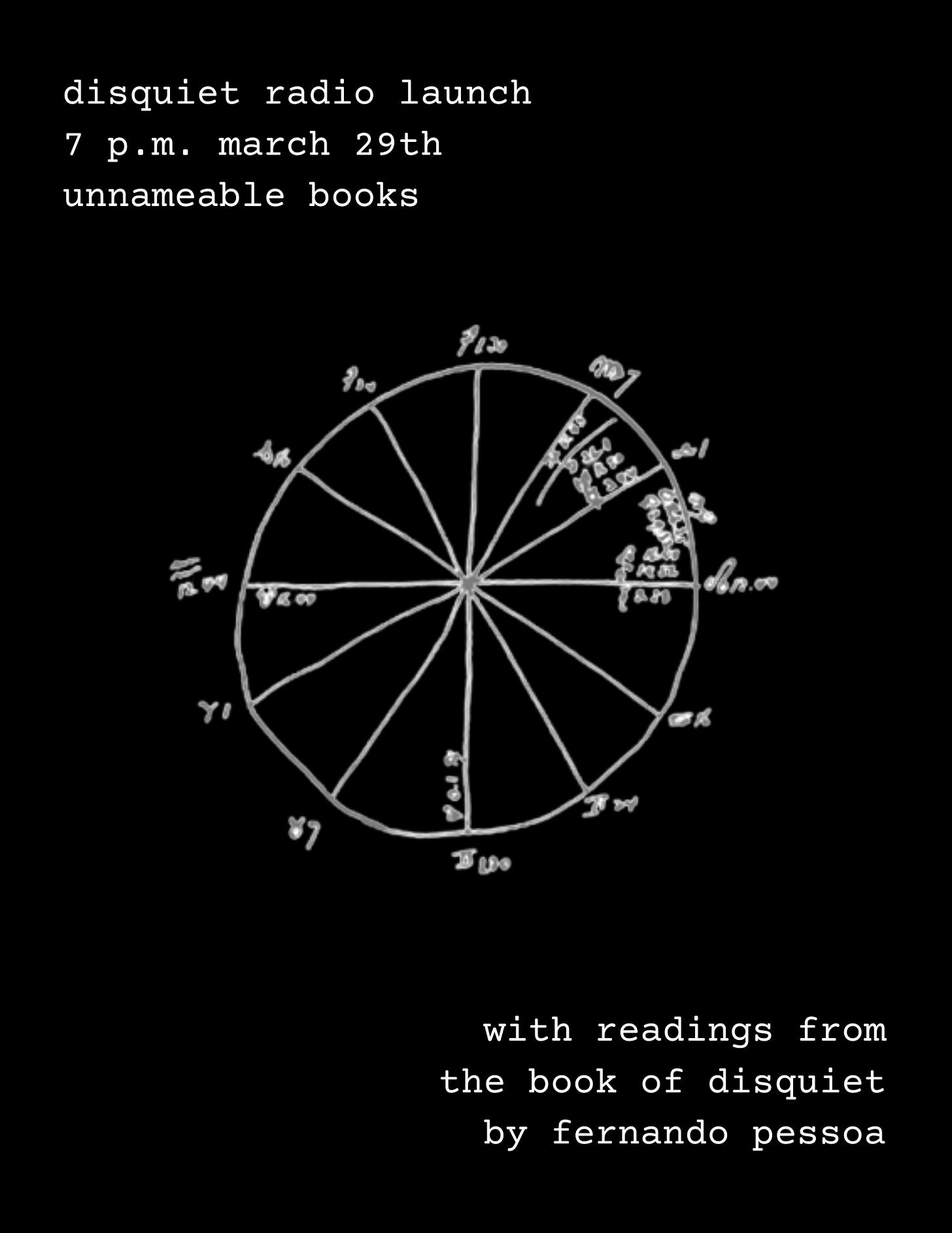 To celebrate the launch of Disquiet Radio, I am hosting a reading of Fernando Pessoa’s work at Unnameable Books in Brooklyn on Friday, March 29th at 7 p.m. It is free and there will be Pessoa books for sale and I will also be handing out zines.